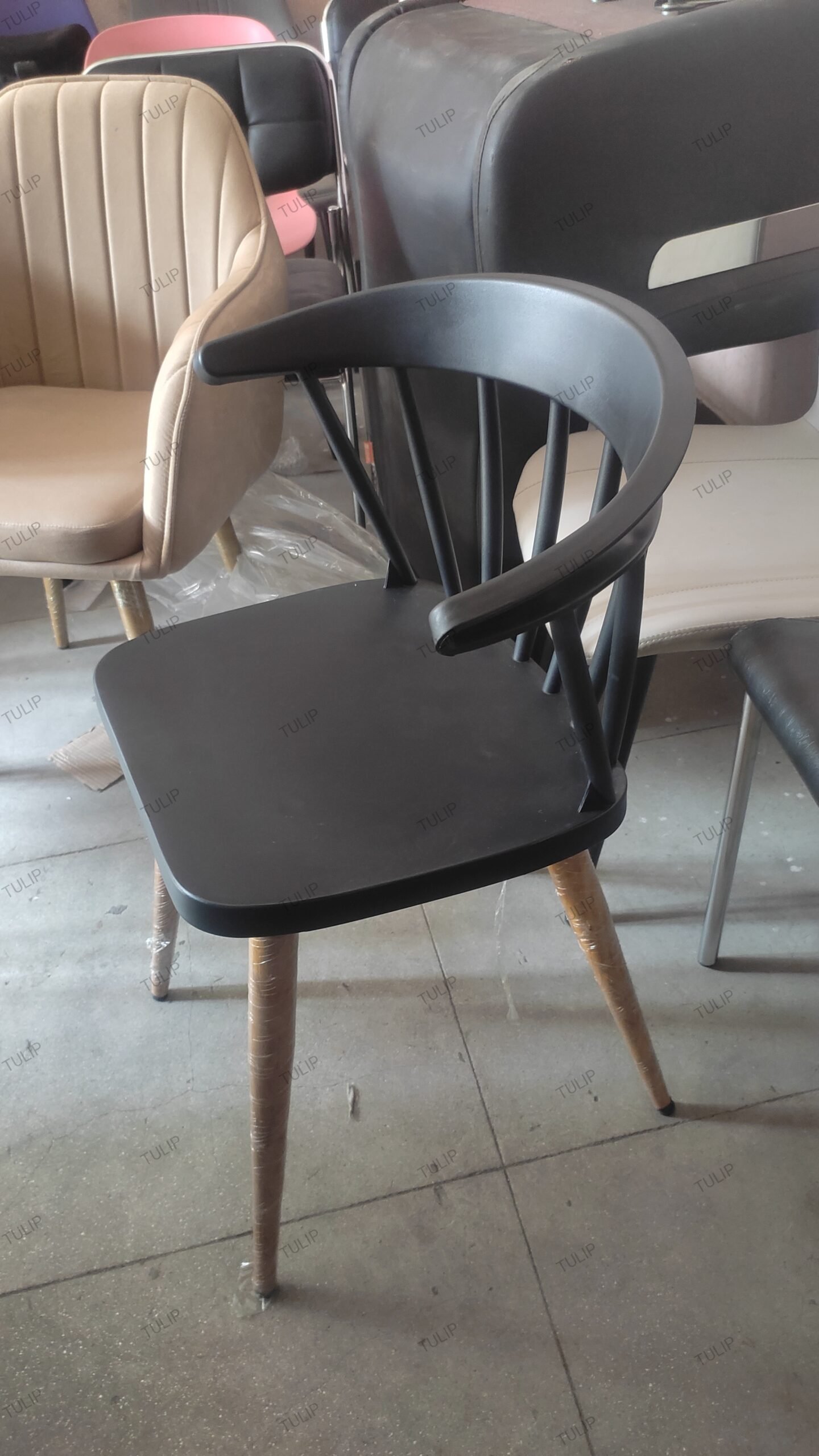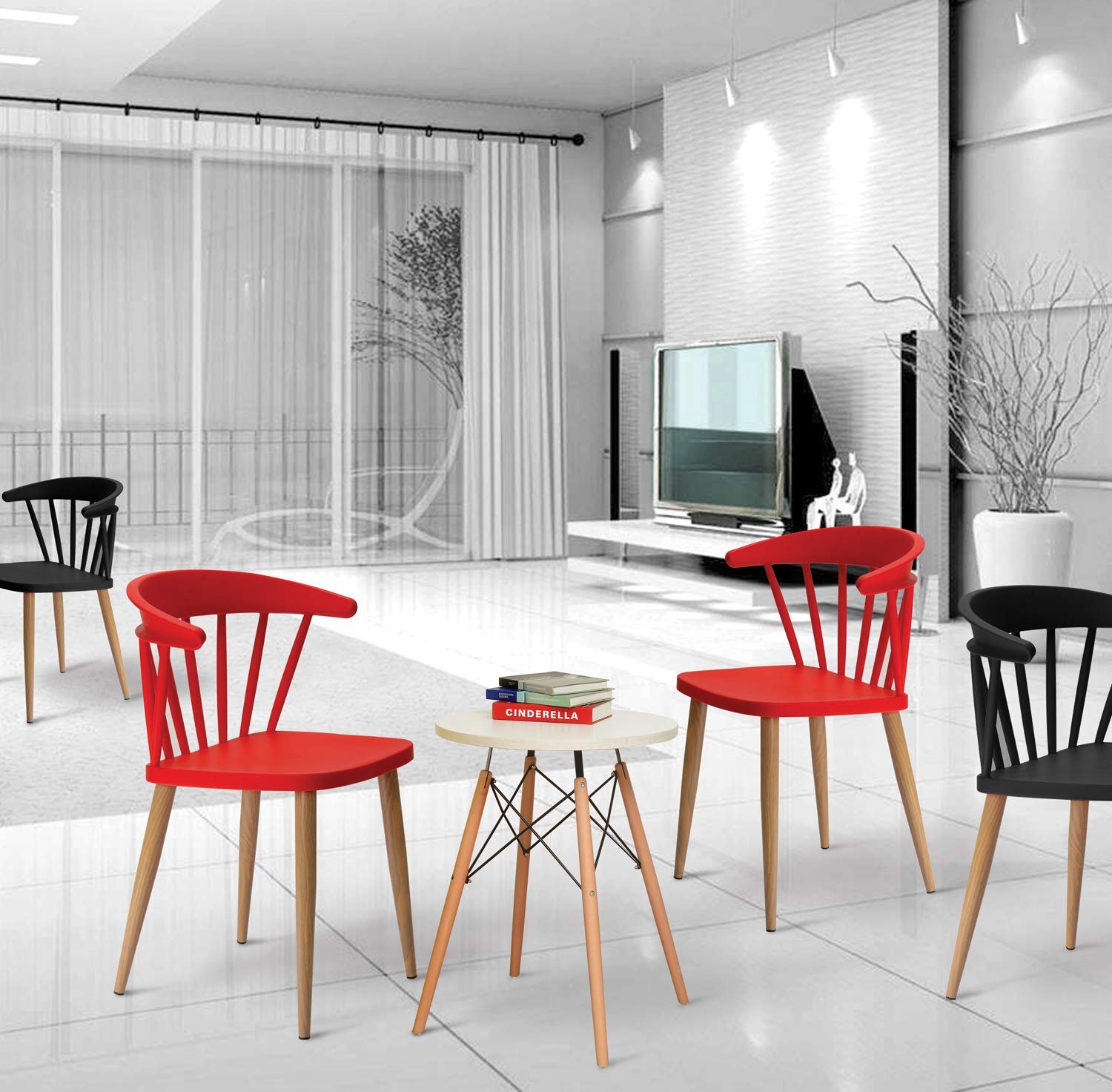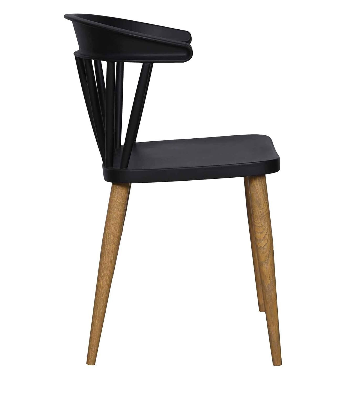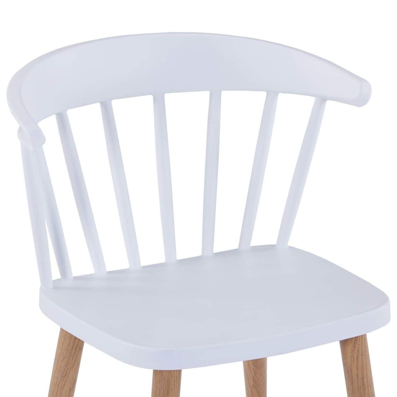 Modern Scandinavian dining chair featuring a smooth plastic seat paired with wooden-effect metal legs. Ideal for homes, cafés, restaurants, hotels, and other commercial spaces.
