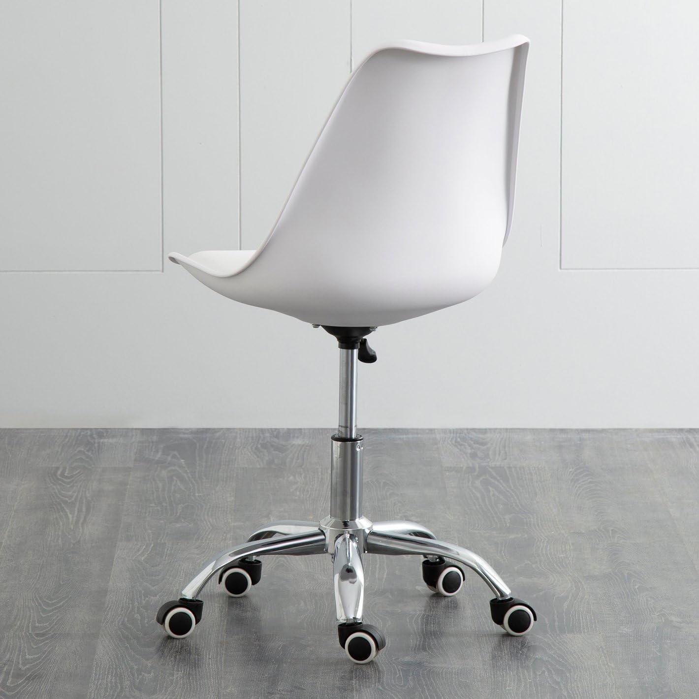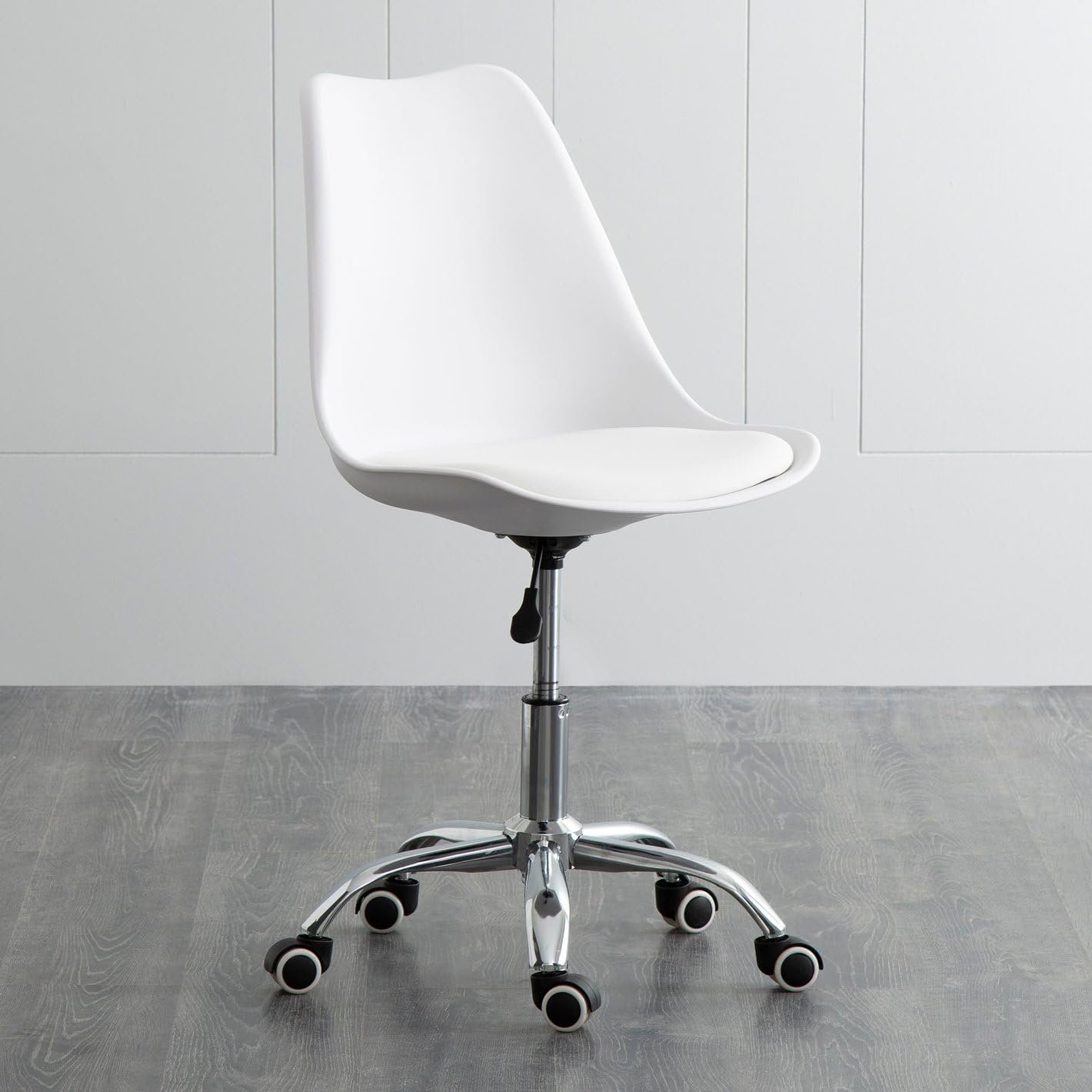 The chair features height adjustment, a 360° swivel base, and smooth caster wheels for effortless mobility.